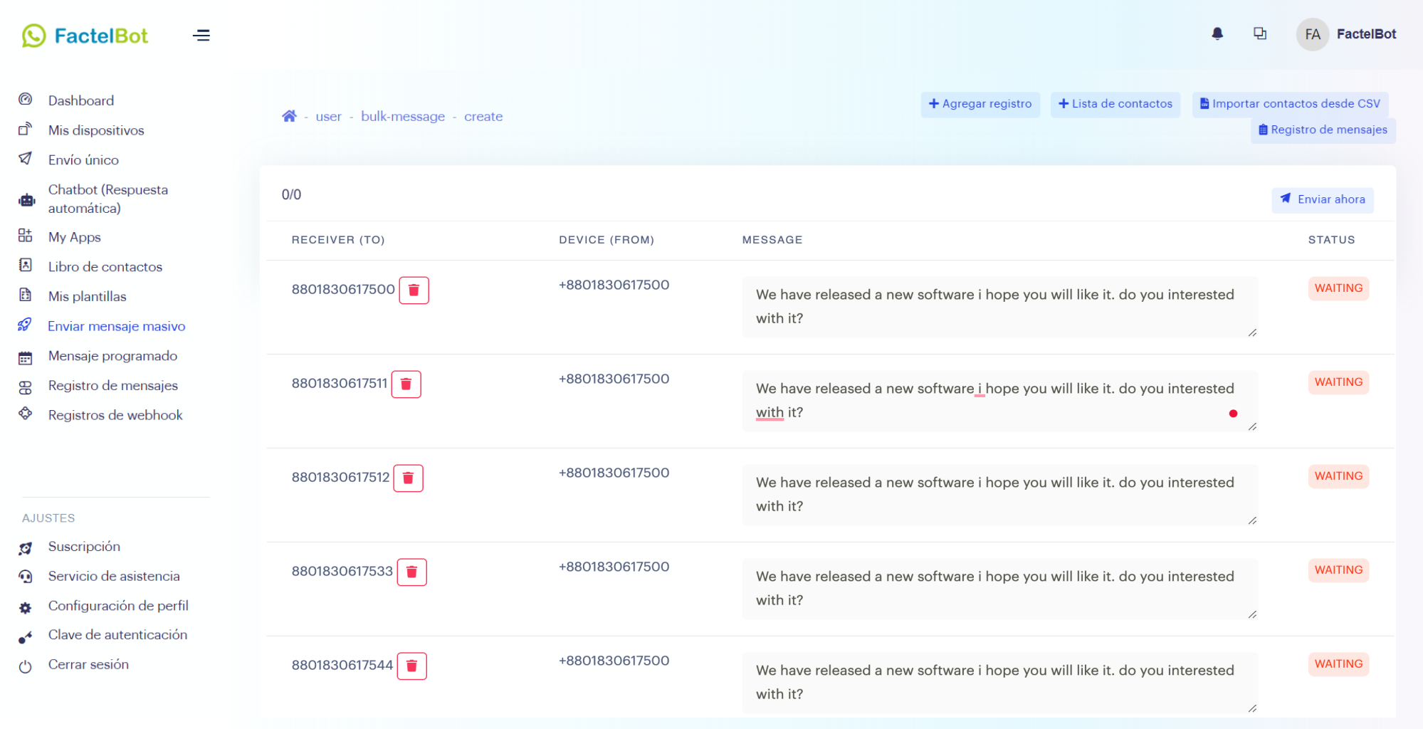 La mensajería masiva es la difusión de una gran cantidad de mensajes para su entrega al cliente desde el software FactelBot.